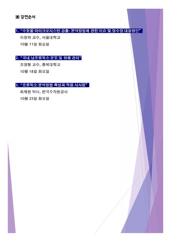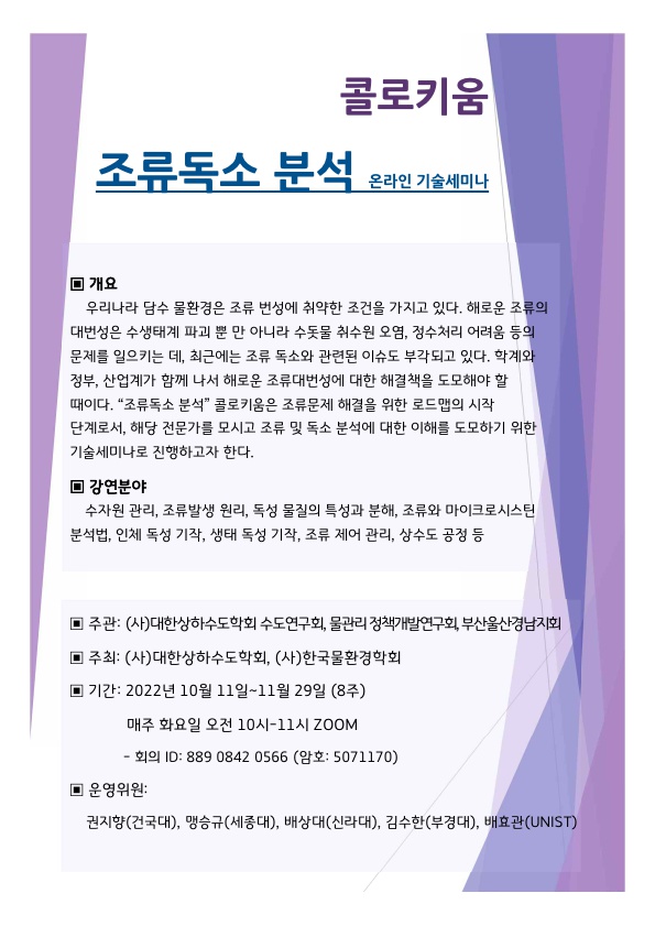 대한상하수도학회와 한국물환경학회 공동으로 “조류독소 분석 콜로키움: 온라인 세미나”를 아래와 같이 개최힙니다.