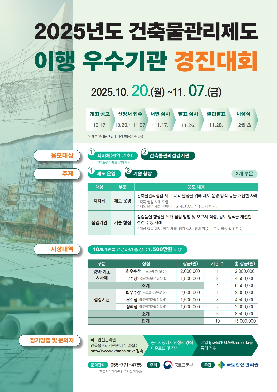국토안전관리원에서 「건축물관리법」 목적에 부합하는 제도 운영과 적극행정 사례, 제도 개선 아이디어 및 건축물관리점검 우수 사례 등을 발굴하여 널리 공유하고자 「2025년도 건축물관리제도 이행 우수기관 경진대회」를 개최합니다.