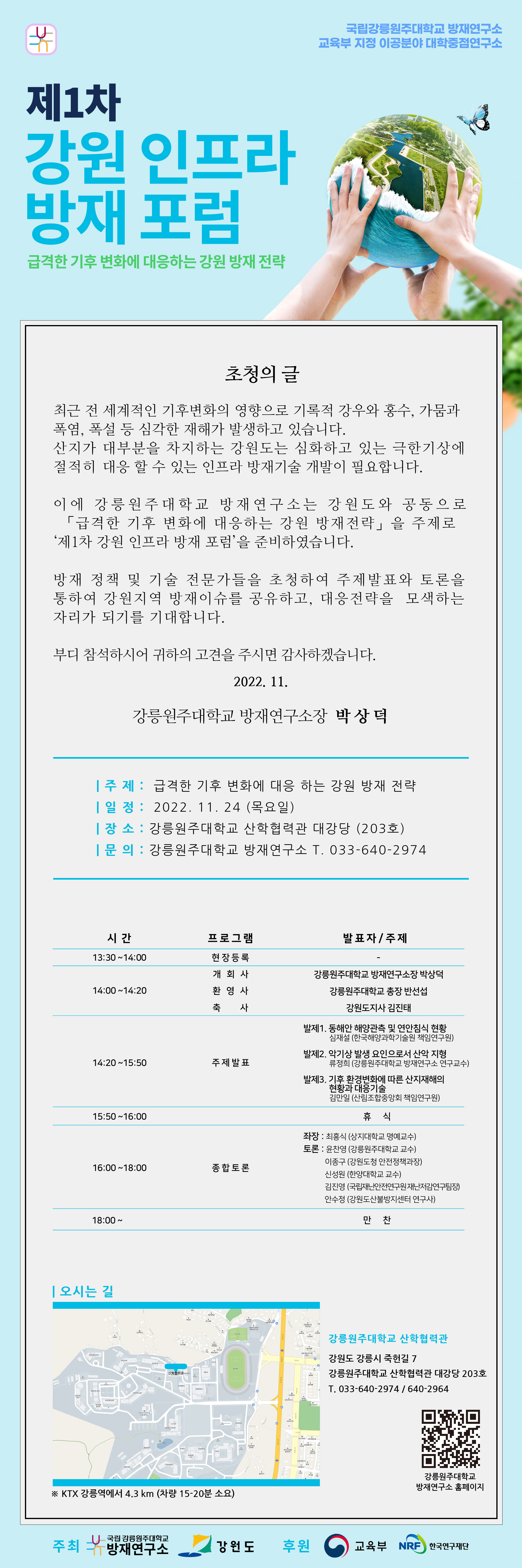 강릉원주대학교 방재연구소에서「급격한 기후 변화에 대응하는 강원 방재전략」을 주제로 ‘제1차 강원 인프라 방재 포럼’ 을 아래와 같이 개최하고자 합니다.