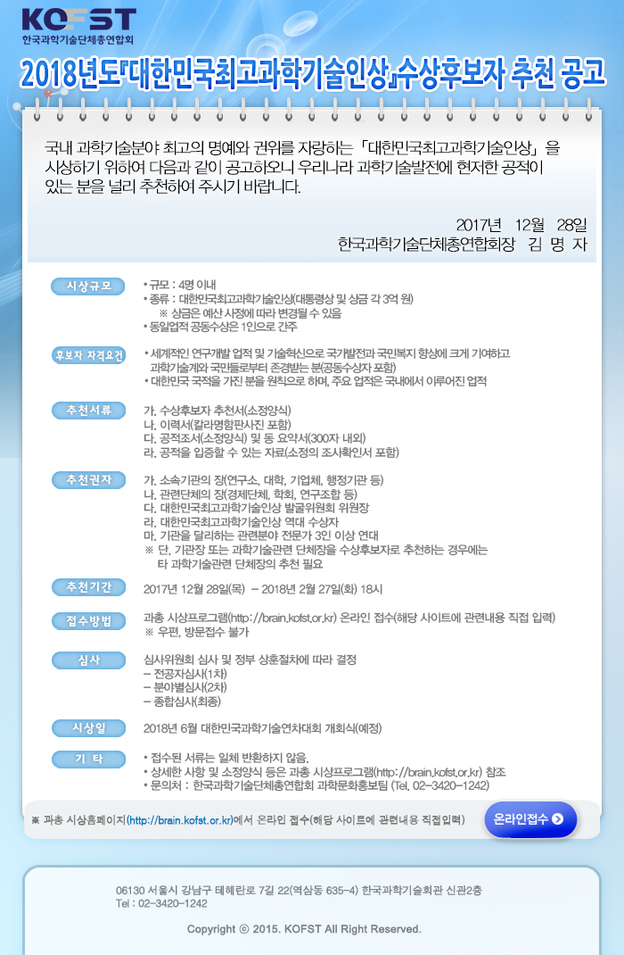 2018 「대한민국최고과학기술인상」수상후보자 추천의뢰 안내