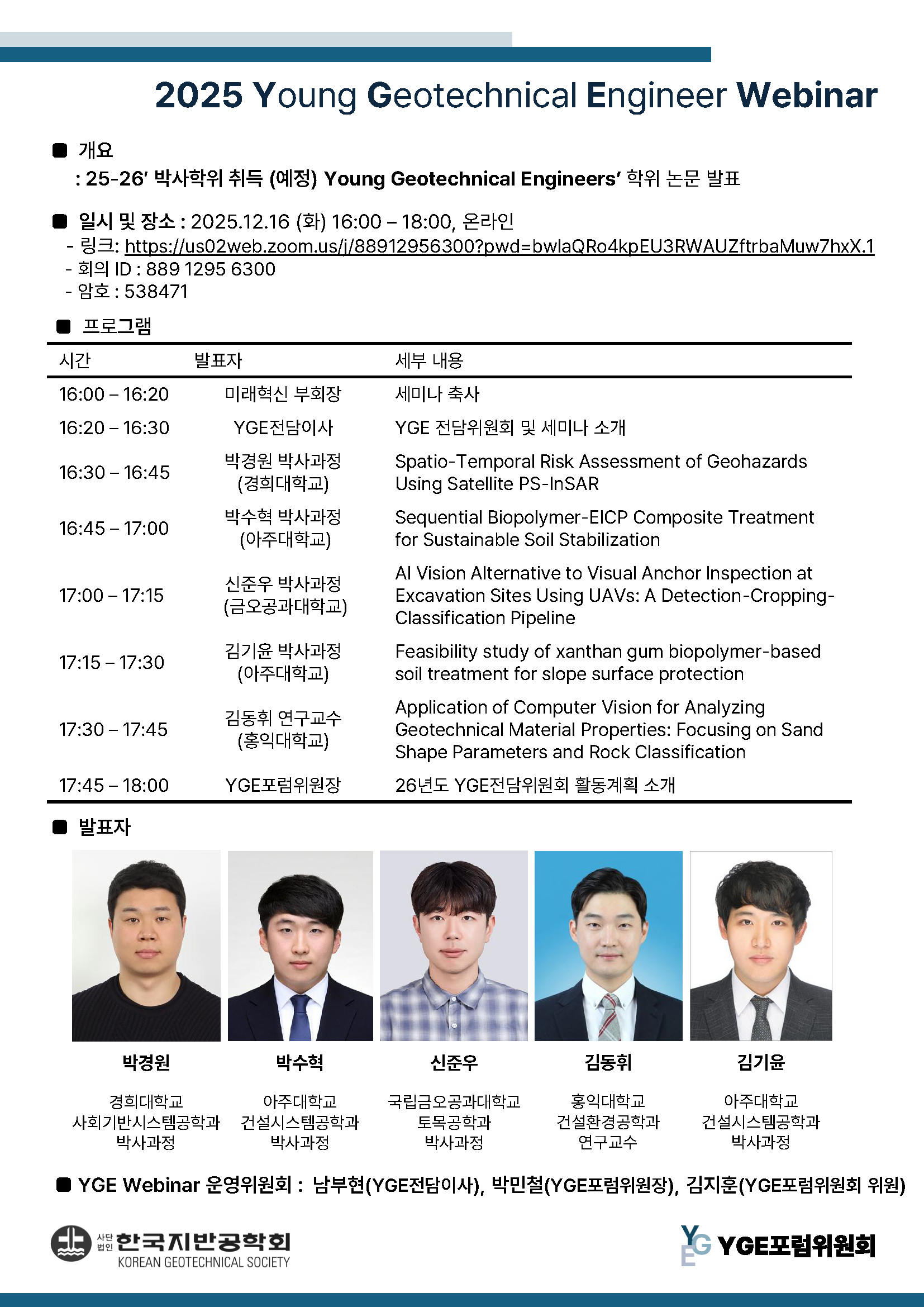 한국지반공학회 YGE전담위원회(YGE포럼위원회 포함)에서 안내드립니다.