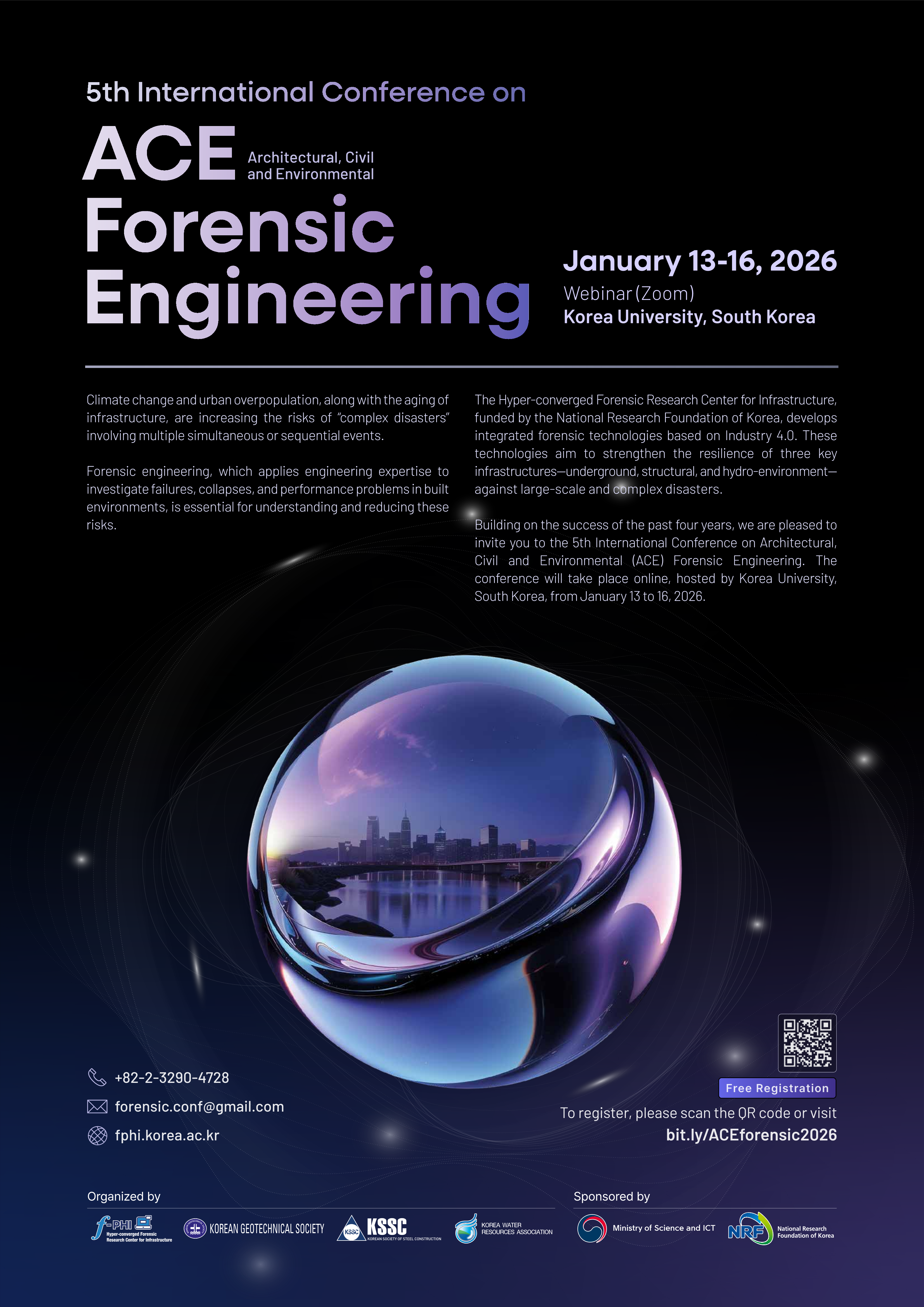 과학기술정보통신부가 지원하는 한국연구재단 기초연구사업분야 선도연구센터지원사업 초융합 건설 포렌식 연구센터에서 국제 학술 교류의 일환으로 아래와 같이 국제학술대회를 개최하오니 회원 여러분들의 많은 관심 부탁드립니다.